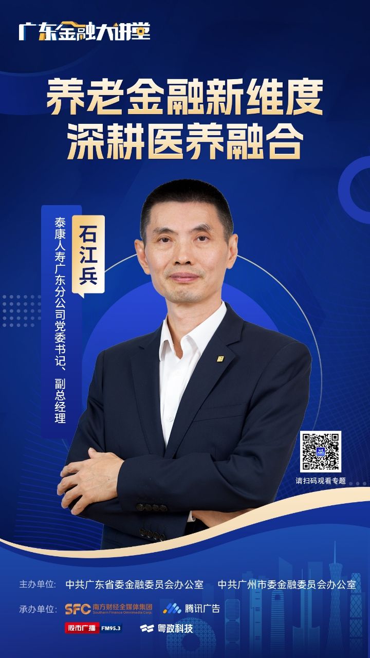 本期节目,我们将继续分享养老金融相关的话题,看看养老金融新维度有哪些创新的做法。今天做客的嘉宾是:泰康人寿广东分公司党委书记、副总经理石江兵。欢迎您!
