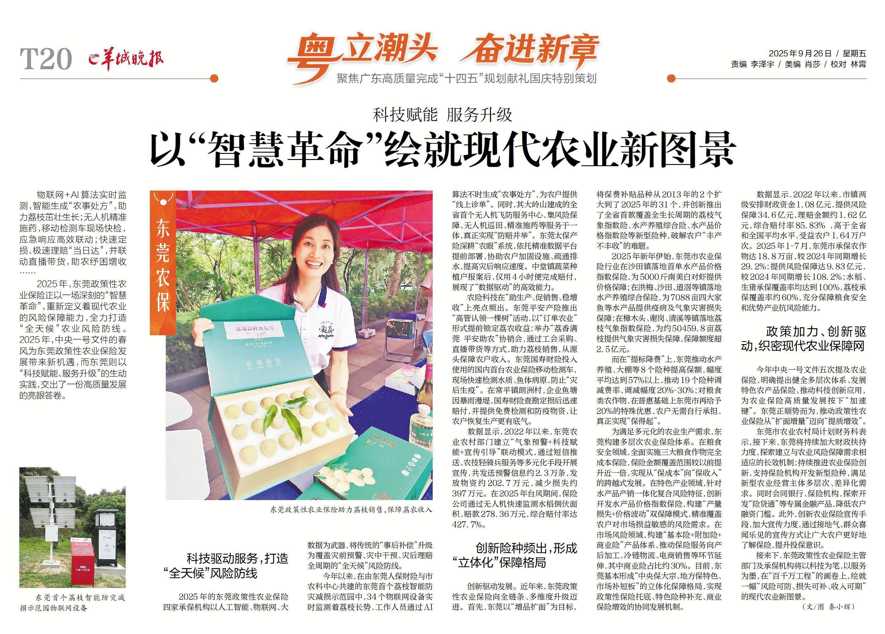 尤为亮眼的是,自2022年2月起,东莞市农业农村局联合羊城晚报及四家农险机构,共同启动“千万农保”政策性农业保险系列宣传行动。通过开设“农业保险高质量发展”“跟着农保员去助农”“微访谈·总经理说”“微视角·故事会”等专栏,以及“小羊探农”“百千万·全莞探”短视频栏目,多维度呈现农保政策创新、服务实践与一线人物风采。