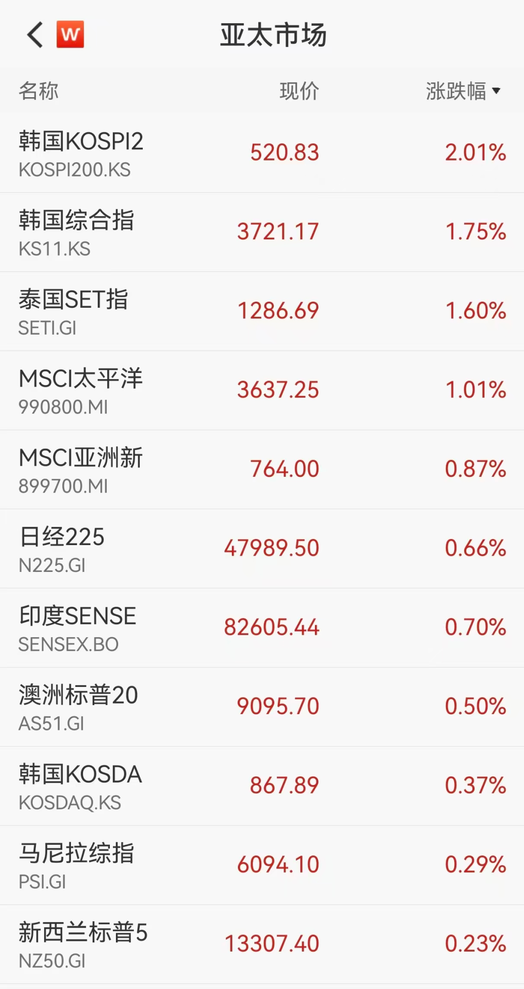 韩国综合指数涨幅超2%,日经225指涨约0.7%,澳大利亚S&P/ASX200指数一度创纪录新高。泰国SET指数、印度SENSE、马尼拉综指等均有不同程度上涨。