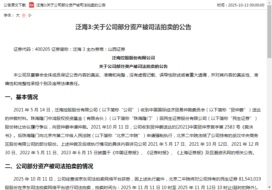 同日,泛海3还发布了关于公司控股股东所持部分公司股份被司法拍卖的进展公告以及关于公司部分资产被司法拍卖的公告。2025年10月11日,泛海3经查询京东司法拍卖网络平台获悉,由于此前的珠海隆门中鸿股权投资基金(有限合伙)(以下简称“珠海隆门”)因民生证券股份有限公司(以下简称“民生证券”)股份转让协议履行争议,向贸仲委申请仲裁。北京二中院将对公司持有的民生证券81,543,019股股份在京东司法拍卖网络平台进行司法拍卖。