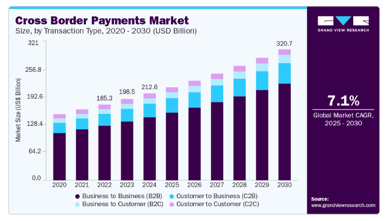 从全球视角看,全球跨境电商的扩张为跨境支付业务打开广阔空间,年均复合增长率达17%,带动跨境支付需求持续释放。FXC Intelligence统计数据显示,2024年全球跨境支付市场规模约为2125.5亿美元,预计2025年可达2276.3亿美元,到2030年将突破3207.3亿美元,年均复合增长率达7.1%,市场增长潜力显著。
