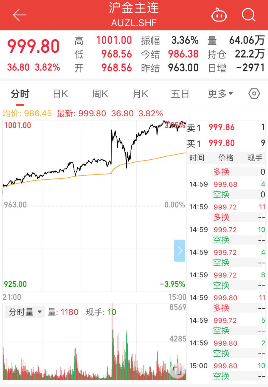 10月17日,国内黄金市场再现历史性时刻,沪金期货主力合约盘中突破1000元/克整数关口,日内涨幅近4%,创历史新高。截至收盘,沪金期货主力合约报999.8元/克。