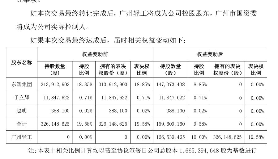 根据协议,广州轻工拟以协议转让方式受让东塑集团持有的公司 166,539,465 股股份,该部分股份为无限售条件流通股,转让股份数量占协议签署日公司总股本的 10.00%,同时东塑集团及其一致行动人拟将持有的公司剩余 159,609,160 股股份(占协议签署日公司总股本的9.58%)对应的表决权委托给广州轻工,广州轻工通过直接持股联合表决权委托的方式获得上市公司 19.58%股份表决权,成为公司新的控股股东。