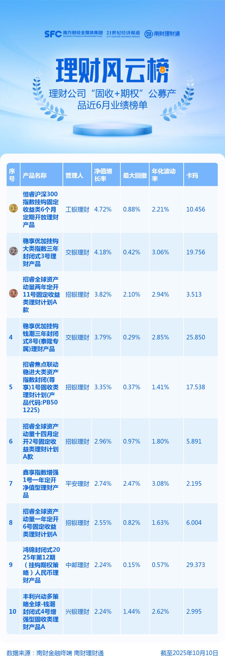 产品统计范围为理财公司发行的公募“固收+期权”理财产品,产品统计截止日期为2025年10月10日,统计区间为近6月。