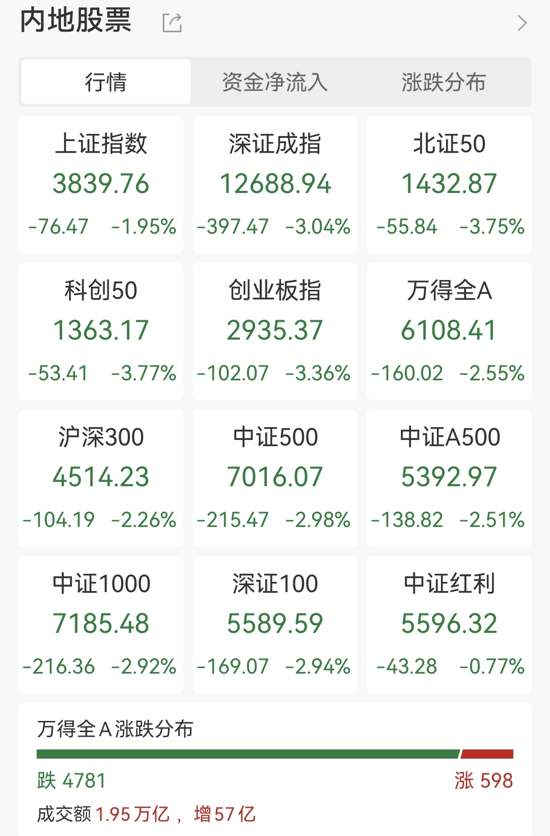 10月17日,A股市场全天震荡调整,三大指数盘中均跌超2%。截至收盘,沪指跌1.95%,深成指跌3.04%,创业板指跌3.36%。沪深两市成交额1.94万亿,较上一个交易日放量69亿。全市场近4800只个股下跌。