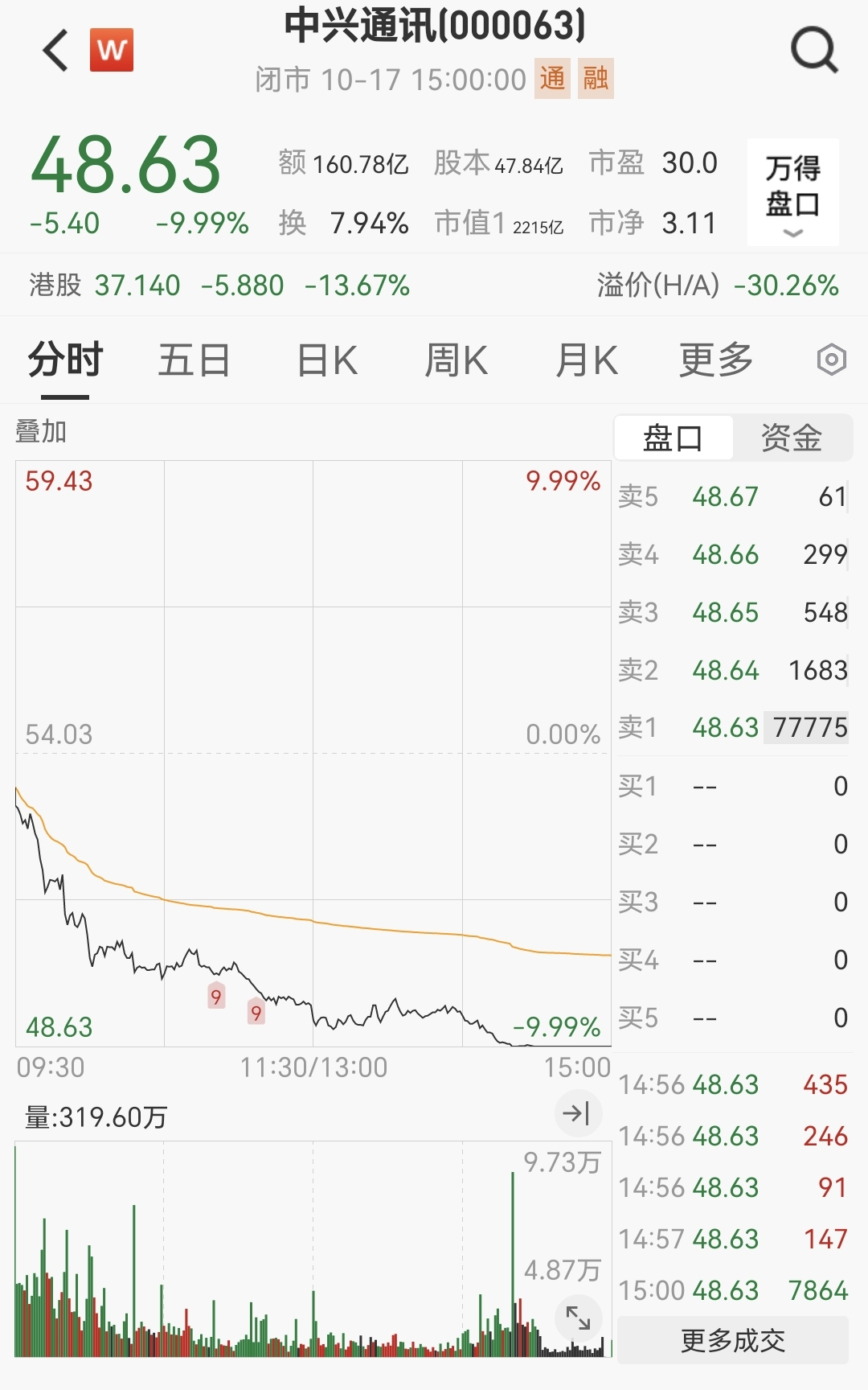 知名个股方面,通讯板块大牛股中兴通讯A股、H股齐跌。截止15:00,中兴通讯港股跌超13%,A股跌停。