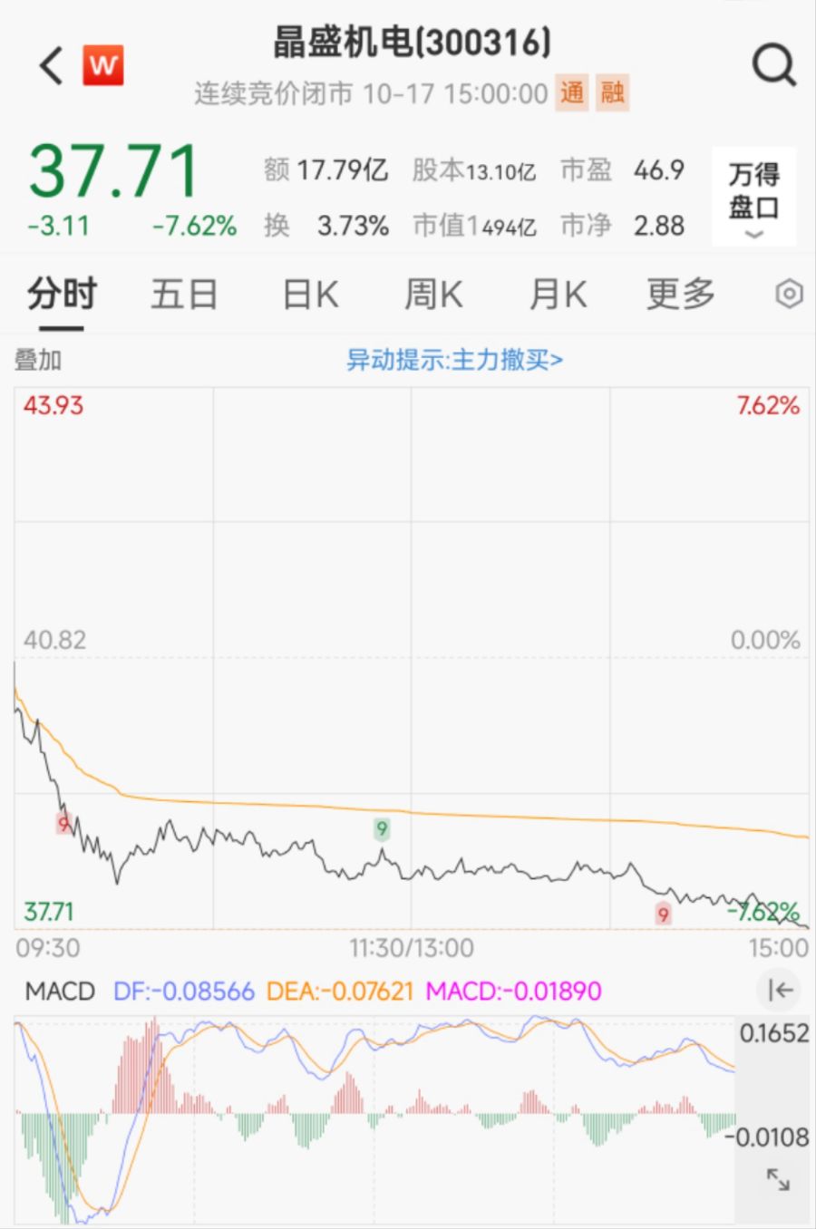 截至10月17日收盘,晶盛机电跌7.62%,报37.71元/股,市值494亿。