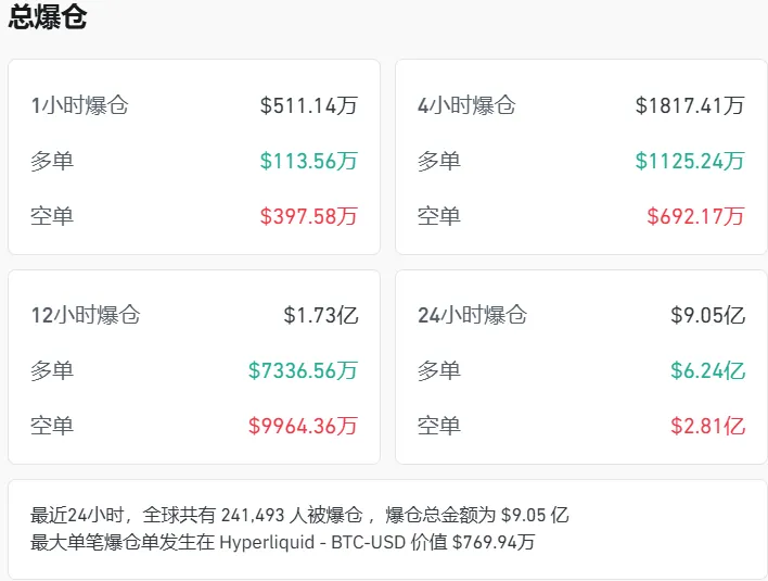 比特币盘中一度跌破107000美元。据Coinglass数据,截至10月18日10:00,比特币报107108.1美元/枚,过去24小时,加密货币全网共有超24万人被爆仓,爆仓总金额超9亿美元。