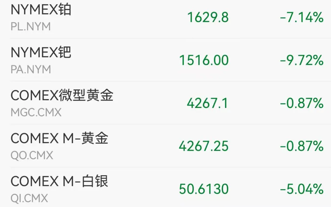 贵金属期货方面,COMEX黄金跌0.85%,报4267.9美元/盎司,COMEX白银跌超5%,报50.625美元/盎司,NYMEX钯金大跌超9%,报1516美元/盎司。NYMEX铂金大跌超7%,回吐过去两个交易日全部涨幅。