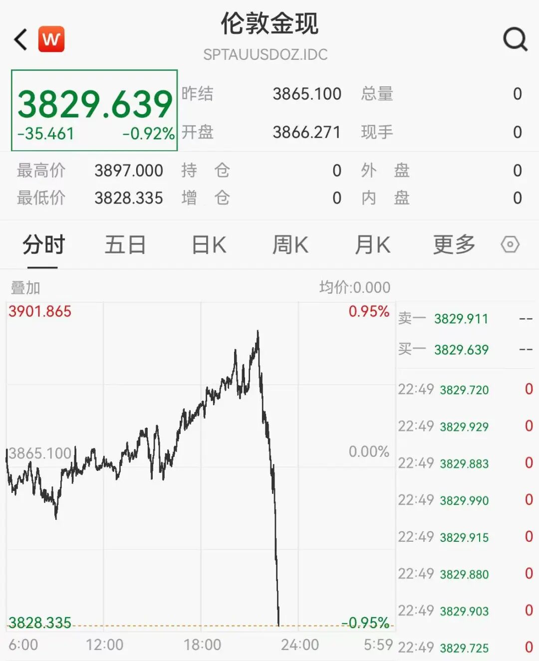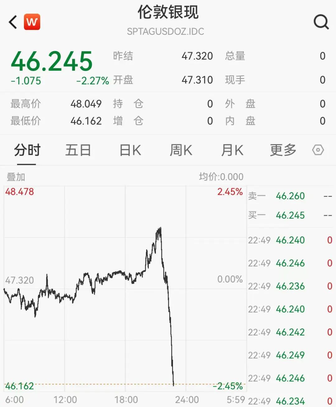 贵金属方面突发跳水,现货黄金和现货白银均由涨转跌。此前,现货白银日内突破48美元关口,续创新高。截至22时50分,现货黄金跌0.92%,报3829.639美元/盎司;现货白银跌幅扩大至2.27%,报46.245美元/盎司。