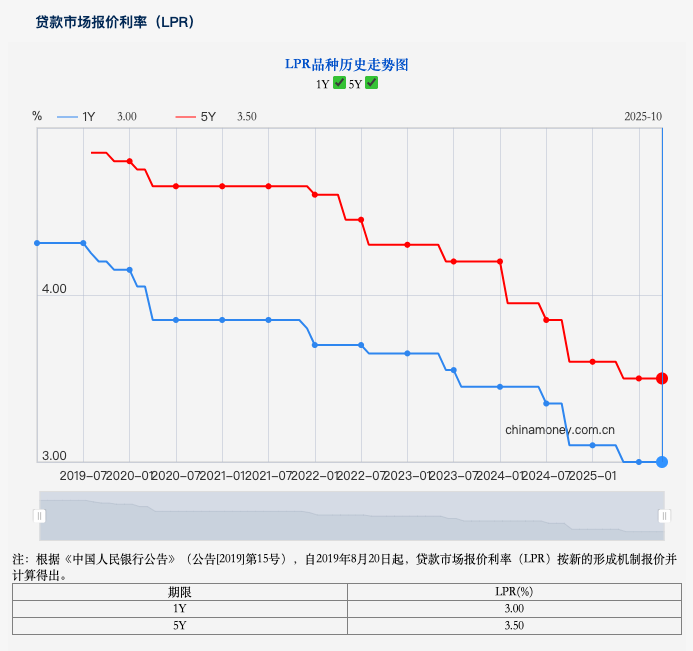 10月LPR报价依然不变,维持了今年5月以来的利率水平。中国人民银行授权全国银行间同业拆借中心公布,2025年10月20日贷款市场报价利率(LPR)为:1年期LPR为3.0%,5年期以上LPR为3.5%。以上LPR在下一次发布LPR之前有效。