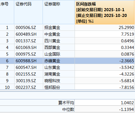 这并不是个案,其他黄金股也普遍出现了冲高回落走势。以纳入申万黄金板块的10只样本股为例,月初以来平均涨幅收窄至1.04%,甚至赤峰黄金、山东黄金等半数企业已经月线已经收阴。