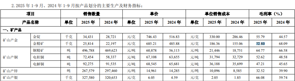 2025年1-9月,公司矿产金产量65吨,同比增加20%,金锭、金精矿等产品销量也有不同程度的增长。
