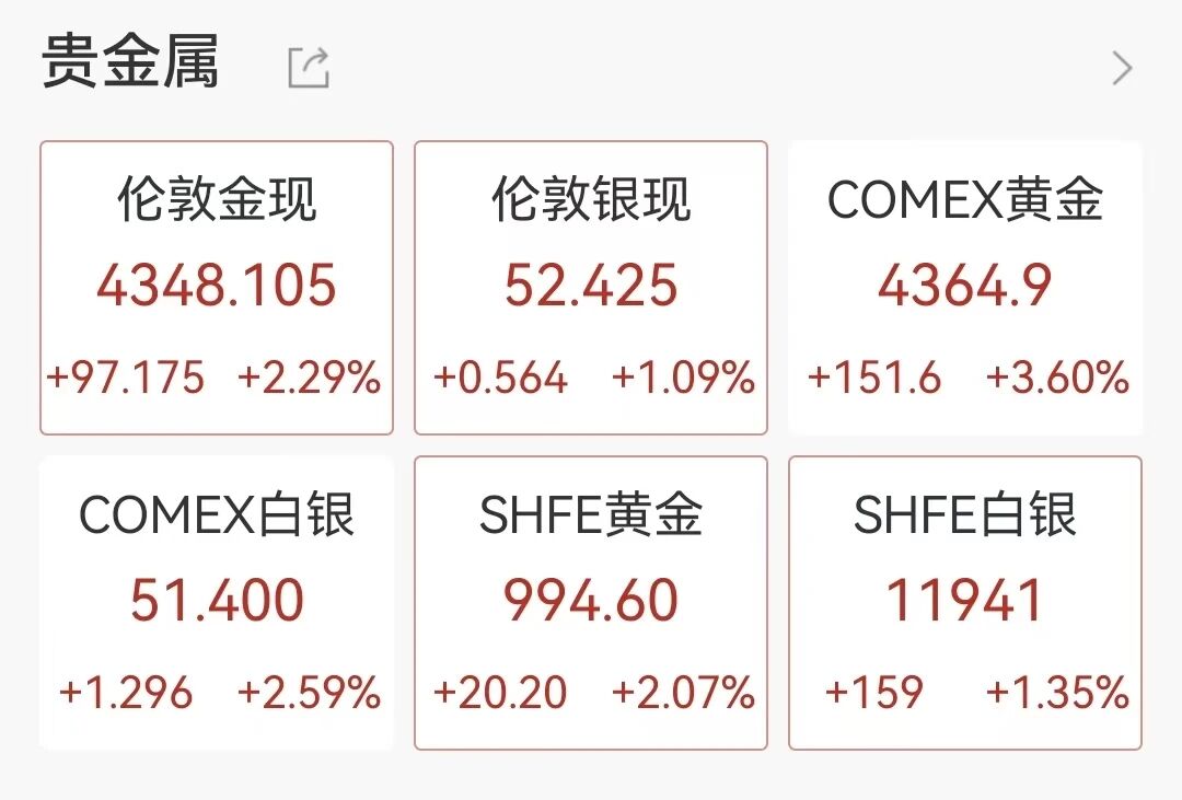 商品市场方面,国际金价经历短期震荡后触及新高,现货黄金报4348美元/盎司,短线拉升超2%;COMEX黄金大涨逾3%,报4364.9美元/盎司。现货白银、COMEX白银均涨超2%。