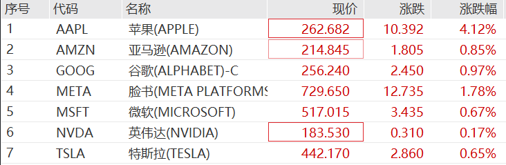 美国科技七巨头集体上涨,苹果涨4.12%,创历史新高,报262.68美元/股,总市值达3.91万亿美元。