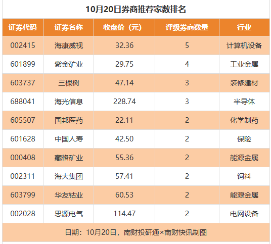 从券商推荐家数来看,10月20日有32家上市公司得到券商推荐,其中海康威视获得5家推荐,紫金矿业获得4家推荐,三棵树获得3家推荐。