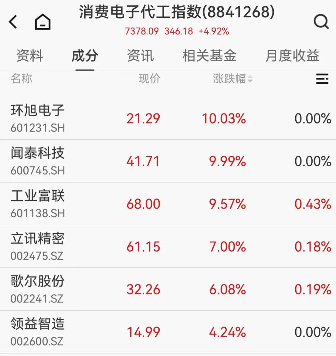10月21日午后,消费电子板块再度拉升,环旭电子10cm涨停封板,闻泰科技涨停,工业富联涨超9%,立讯精密涨超7%,歌尔股份、寒武纪、兆易创新纷纷上涨。