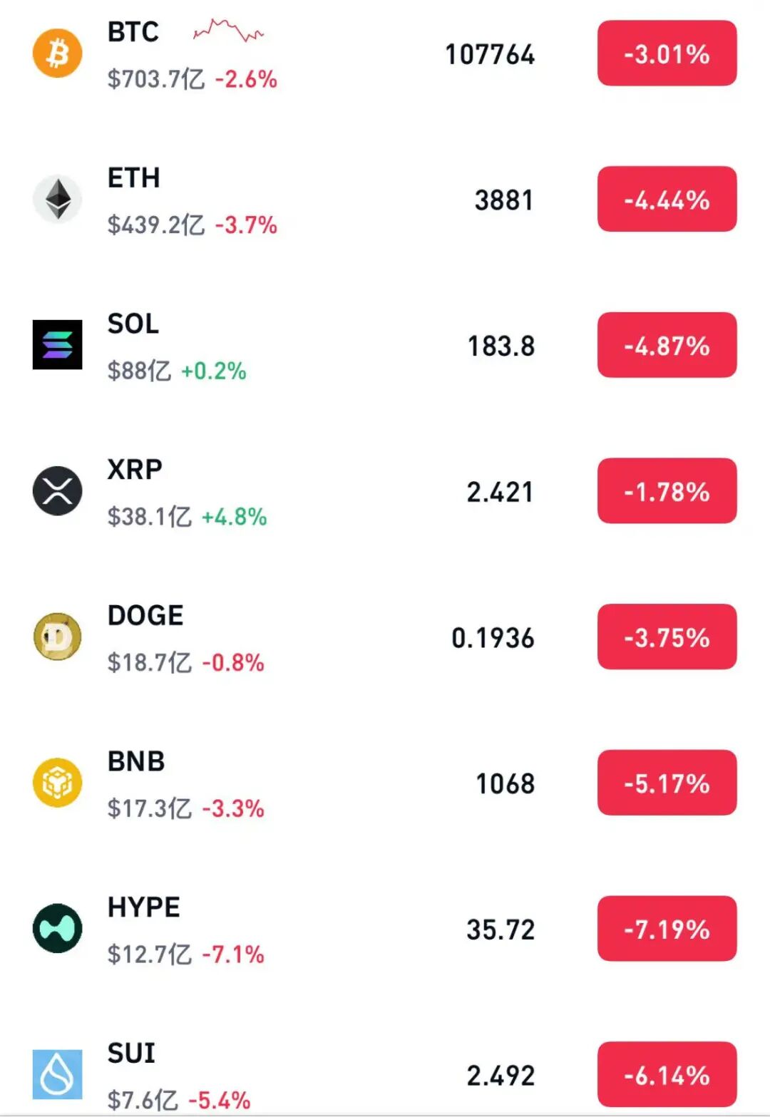 截至发稿,比特币报10.77万美元,24小时内跌幅超过3%;以太坊跌超4%;BNB跌超5%。
