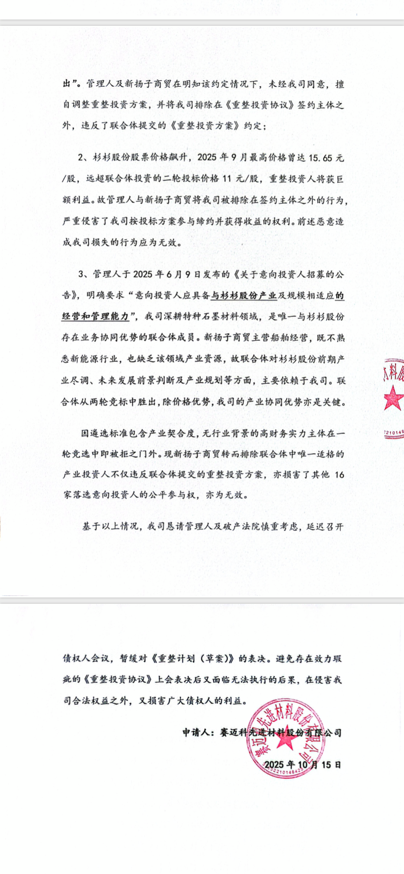 诉状还列出三项理由,包括联合体约定中明确更换联合体成员需原成员一致通过、作为重整抵押品的杉杉股份股价近期明显上涨并存大额套利空间引发恶意更换行为以及联合体成员扬子江在遴选初期依赖赛迈科的产业契合要求通过遴选。