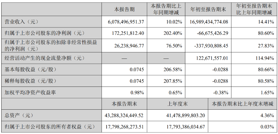 今年第三季度,科大讯飞营业收入60.78亿元,同比增长10.02%;毛利润为24.5亿元,同比增长8.6%;归母净利润1.72亿元,同比大幅增长202.40%;扣非归母净利润0.26亿元,同比增长76.50%。