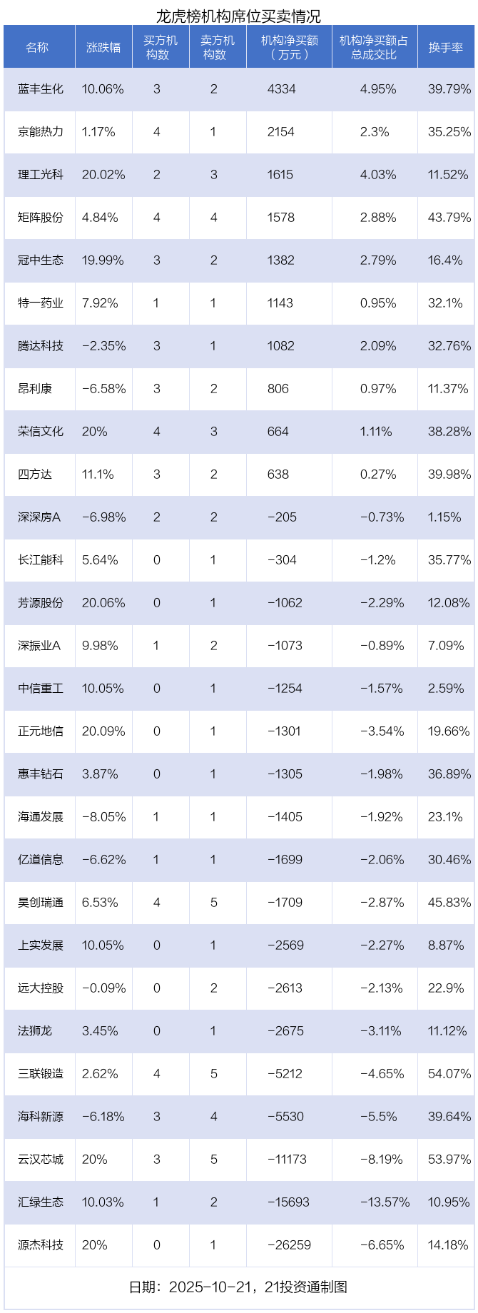 10月21日,28只个股龙虎榜出现了机构的身影,机构合计净卖出6.76亿元。具体来看,机构净买入10股,净卖出18股。