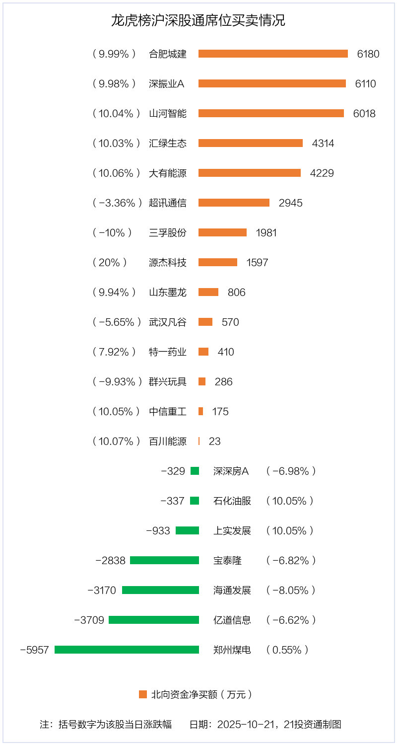 10月21日,北向资金参与龙虎榜中的个股共有21只,合计净买入1.84亿元。其中沪股通净买入6 股,净卖出5 股,合计净卖出2283.02万元;深股通净买入8 股,净卖出2 股,合计净买入2.07亿元。