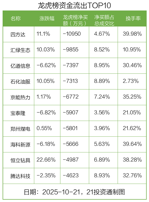 而龙虎榜中资金净流出最多的是四方达(300179.SZ),被净卖出为1.09亿元,占总成交金额的4.67%。四方达收盘上涨11.1%,换手率为39.98%。