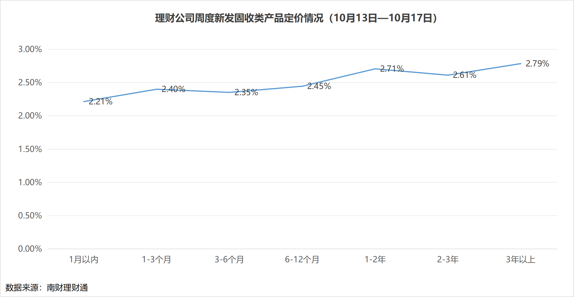 周度收益情况:整体上,截至10月20日,公募人民币理财产品近一周平均净值增长率为0.07%。其中,固定收益类理财近一周平均净值增长率为0.08%,而混合类、权益类近一周平均净值增长率则告负,分别为-0.07%、-1.30%。