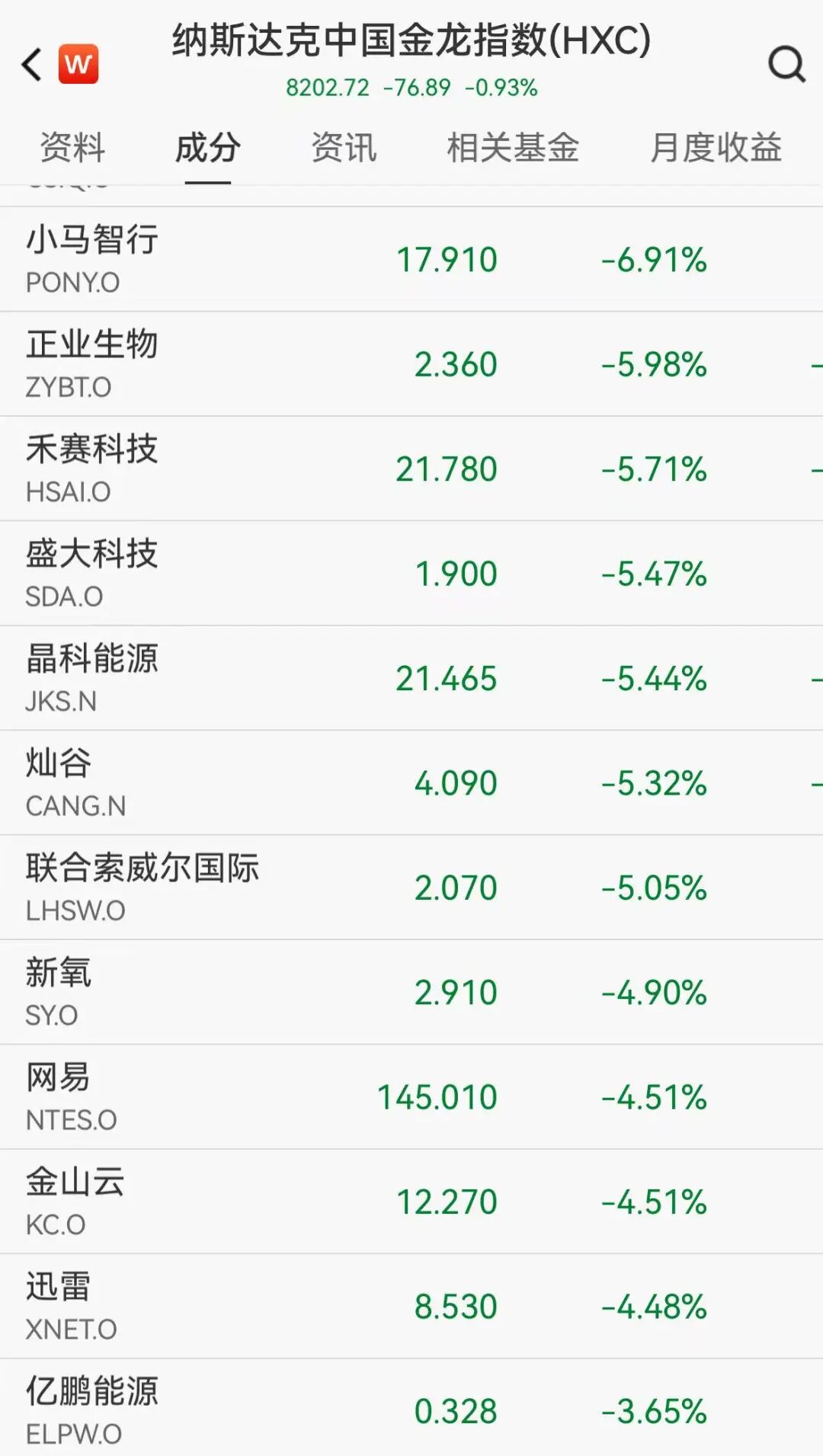 热门中概股多数下跌,纳斯达克中国金龙指数跌0.92%,万得中概科技龙头指数跌0.90%。个股方面,小马智行跌近7%,禾赛科技跌超5%,晶科能源跌超5%,网易跌逾4%,金山云跌超4%,奇富科技涨超2%,阿里、拼多多微跌,京东、百度跌超1%,富途跌超2%,小鹏跌超1%。