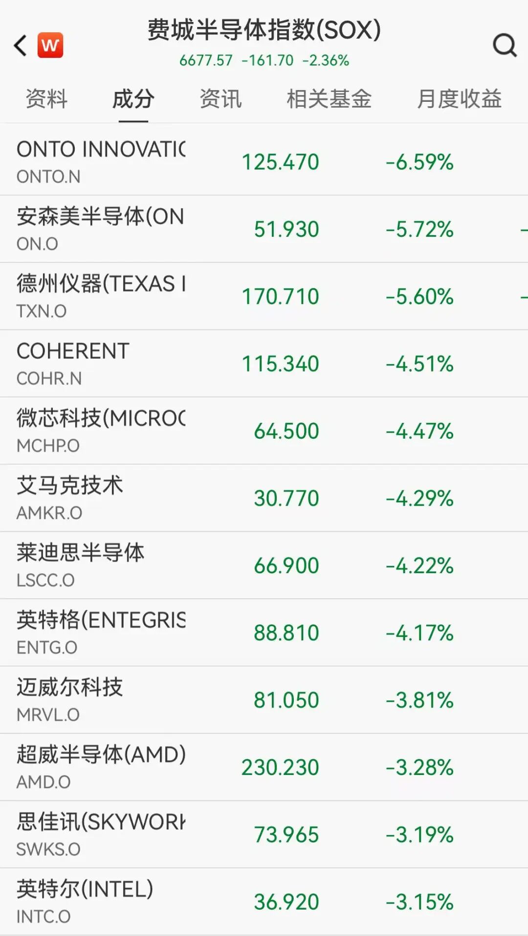 芯片股多数下跌,费城半导体指数跌2.36%,安森美半导体跌逾5%,德州仪器跌超5%,微芯科技跌逾4%,迈威尔科技跌超3%,超威半导体跌逾3%。