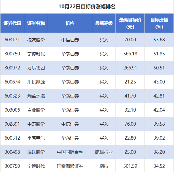 南财投研通数据显示,10月22日,券商给予上市公司目标价共45次,按最新收盘价计算,目标价涨幅排名居前的公司有税友股份、宁德时代、万辰集团,目标价涨幅分别为53.68%、51.85%、50.51%,分别属于IT服务、电池、休闲食品行业。
