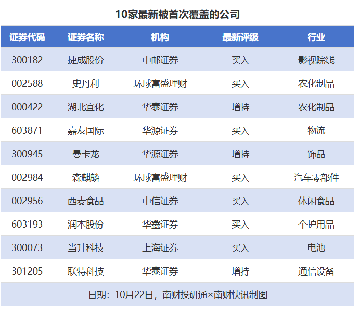 首次覆盖方面,10月22日券商共给出了10次首次覆盖,其中捷成股份获得中邮证券给予“买入”评级,史丹利获得环球富盛理财给予“买入”评级,湖北宜化获得华泰证券给予“增持”评级,嘉友国际、曼卡龙获得华源证券分别给予“买入”“增持”评级。