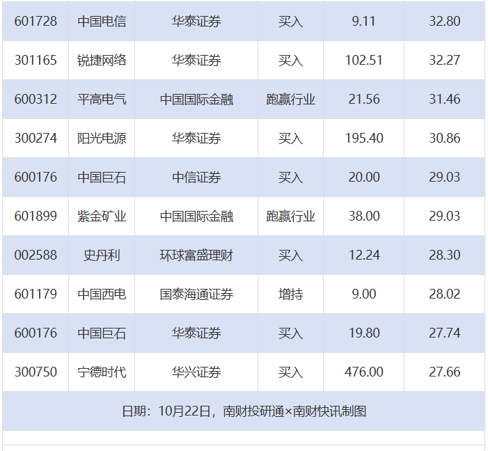 从券商推荐家数来看,10月22日有65家上市公司得到券商推荐,其中中国巨石获得6家推荐,宁德时代获得6家推荐,润本股份获得5家推荐。