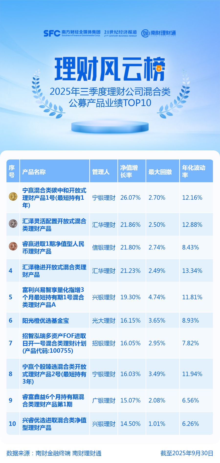 宁银理财“宁赢混合类碳中和开放式理财产品1号(最短持有1年)”、汇华理财“汇泽灵活配置开放式混合类理财产品”以及信银理财“睿赢进取1期净值型人民币理财产品”依次位列榜单前三,净值增长率分别为26.07%、21.86%、21.80%。