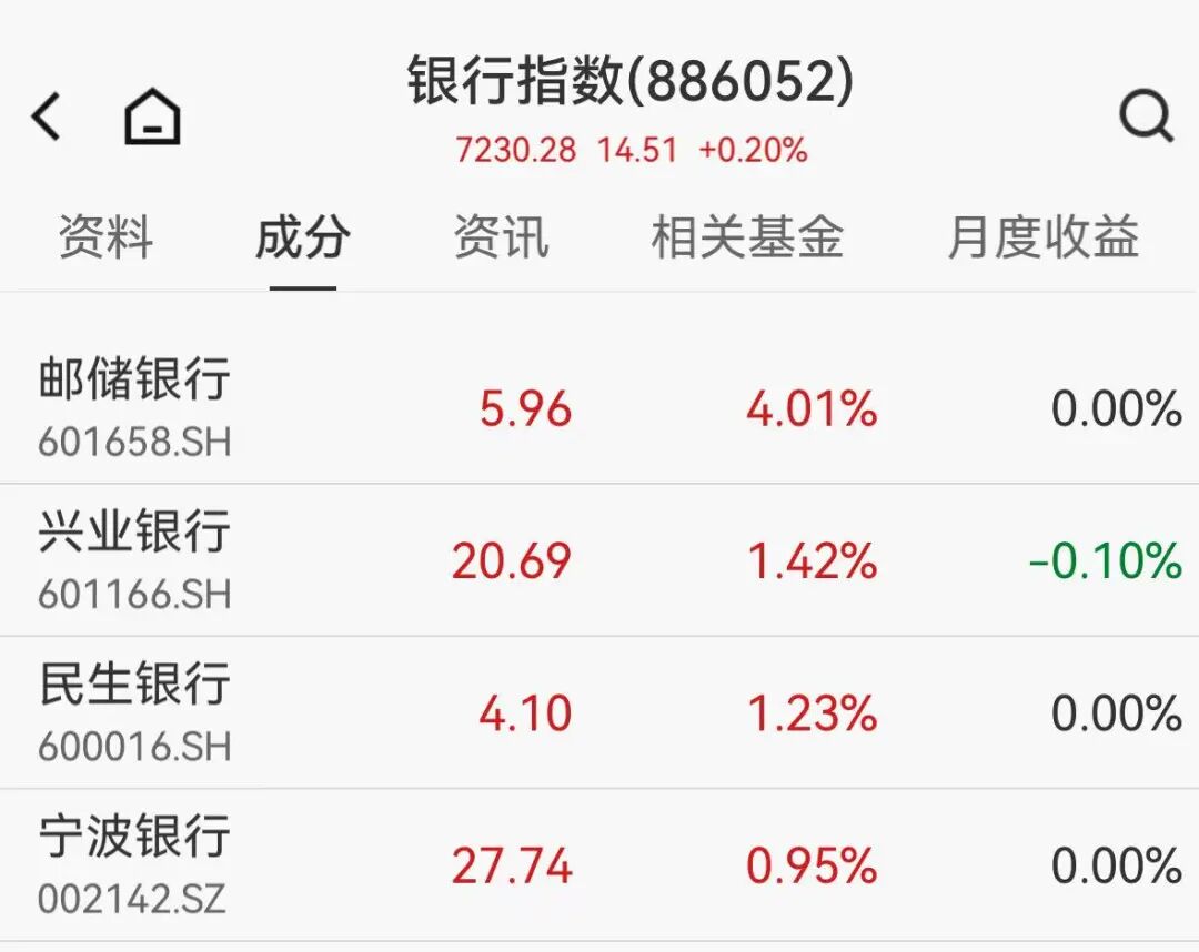 银行板块开盘高后,随后涨幅收窄。邮储银行涨超4%,兴业银行、民生银行等跟涨。