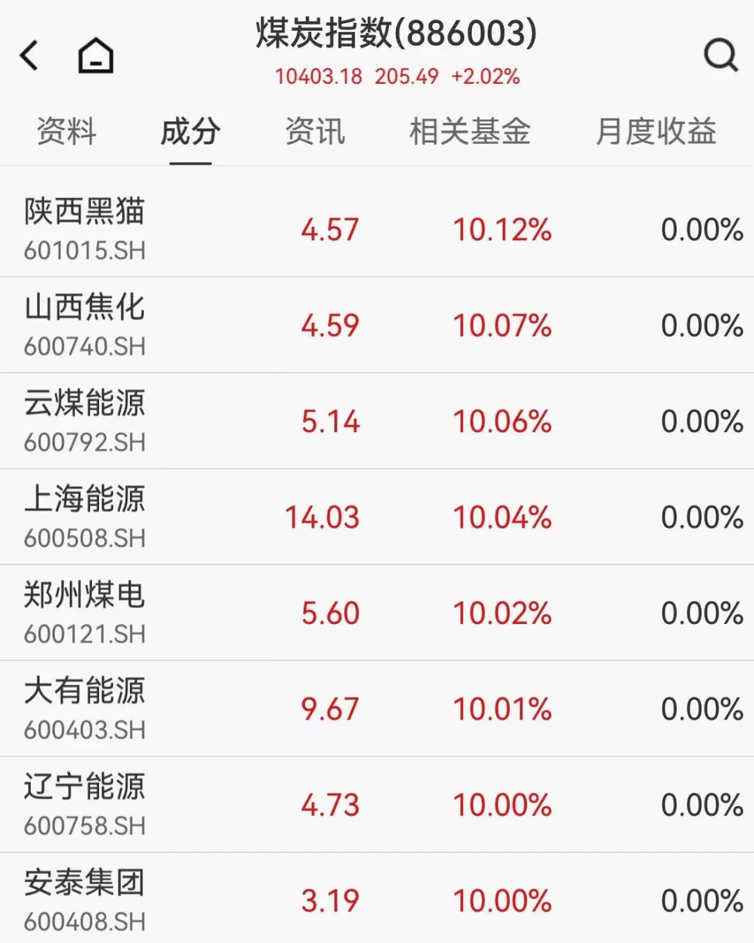 煤炭板块强势走高,陕西黑猫、郑州煤电、云煤能源、上海能源、辽宁能源等多股涨停。