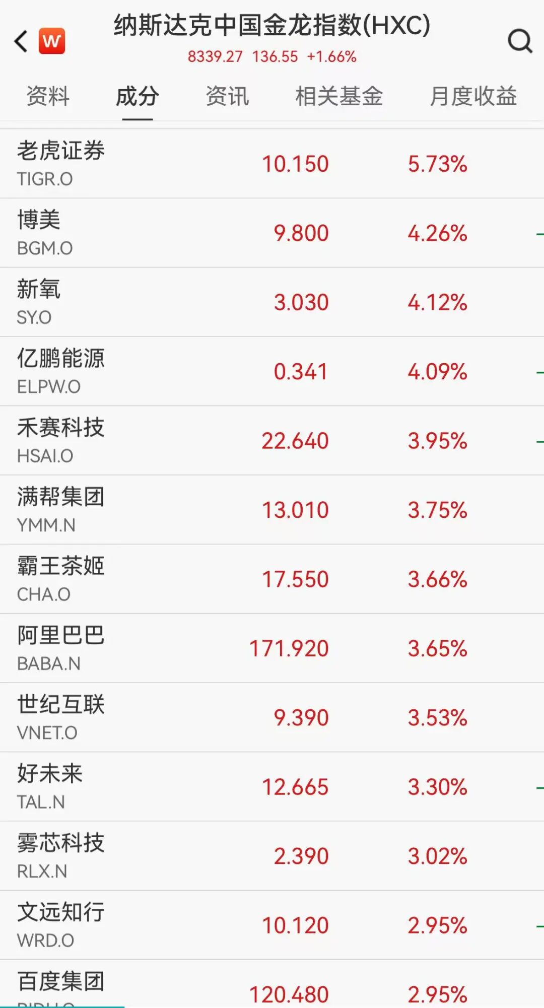 热门中概股多数上涨,纳斯达克中国金龙指数涨1.66%,万得中概科技龙头指数涨2.65%。个股方面,老虎证券涨近6%,禾赛科技涨近4%,满帮集团涨超3%,阿里巴巴涨逾3%,世纪互联涨超3%;百度涨近3%。