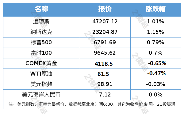 1、10月24日,美股三大指数集体收涨,均再创历史新高。纳斯达克中国金龙指数收涨0.27%,本周累涨2.4%。欧洲主要股指多数收涨,英国股市连续两个交易日创新高。COMEX黄金期货跌0.65%,报4118.5元/盎司,本周累跌2.25%。COMEX白银期货跌0.6%,报48.42美元/盎司,本周累跌3.36%。