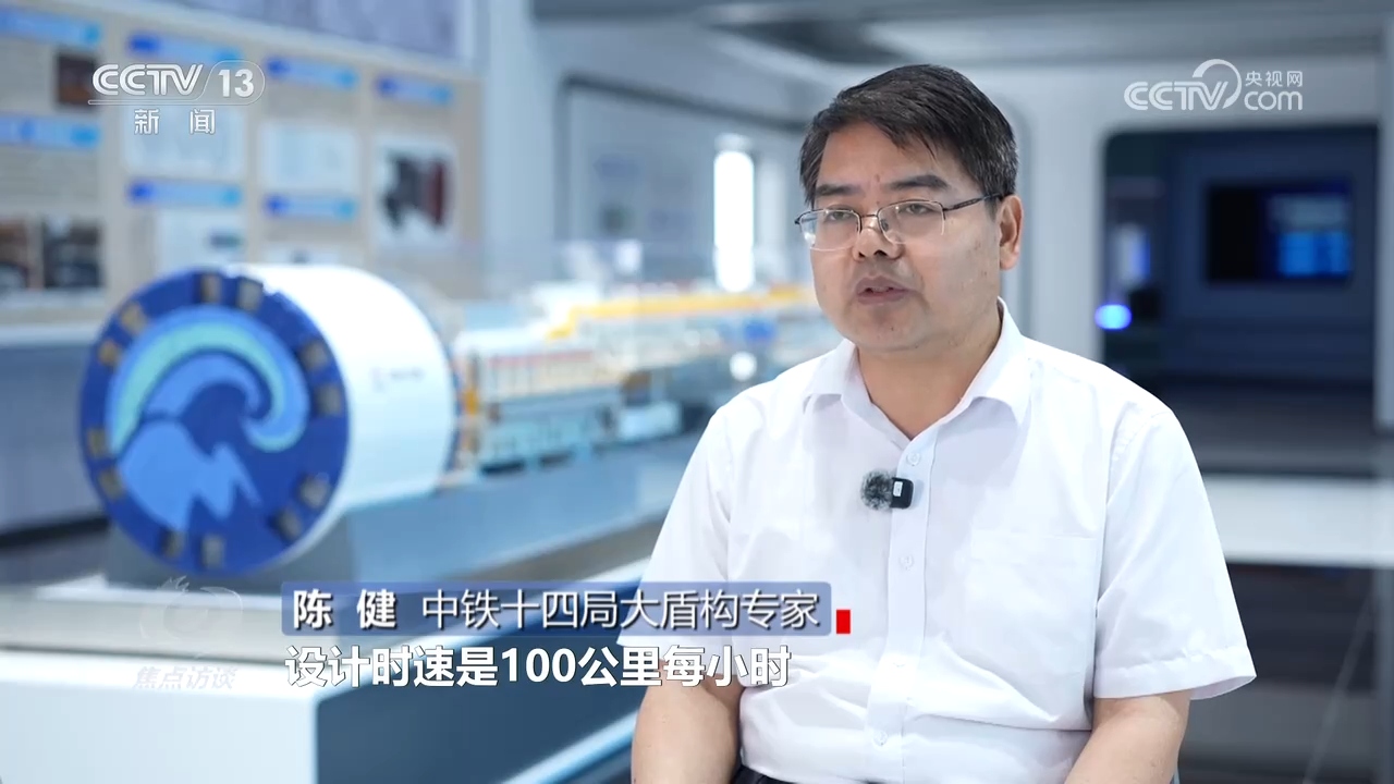 中铁十四局大盾构专家陈健:“它采用的是双向六车道,采用高速公路的设计标准,设计时速是100公里每小时,所以它比城市干道或者其他过江通道建设的标准更高,速度更快,所以隧道断面也达到了16米。隧道采用盾构法施工,它要实现一边掘进,一边要进行衬砌安装,所以隧道的开挖直径要大于16.64米。”
