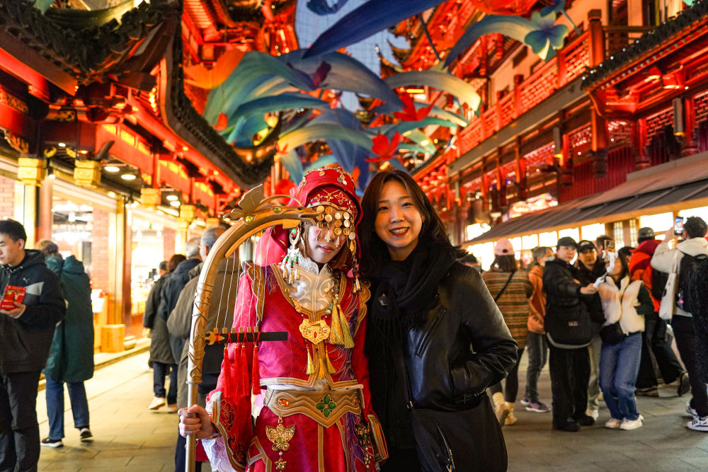2024年11月30日,来自韩国的游客(右)在上海豫园商城与游戏角色装扮者合影。新华社发(谢鑫 摄)
