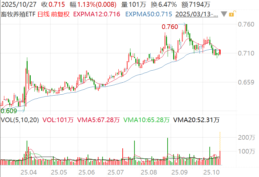 畜牧养殖ETF(516670)涨1.13%,盘中成交超7200万元,较前一日显著放量。