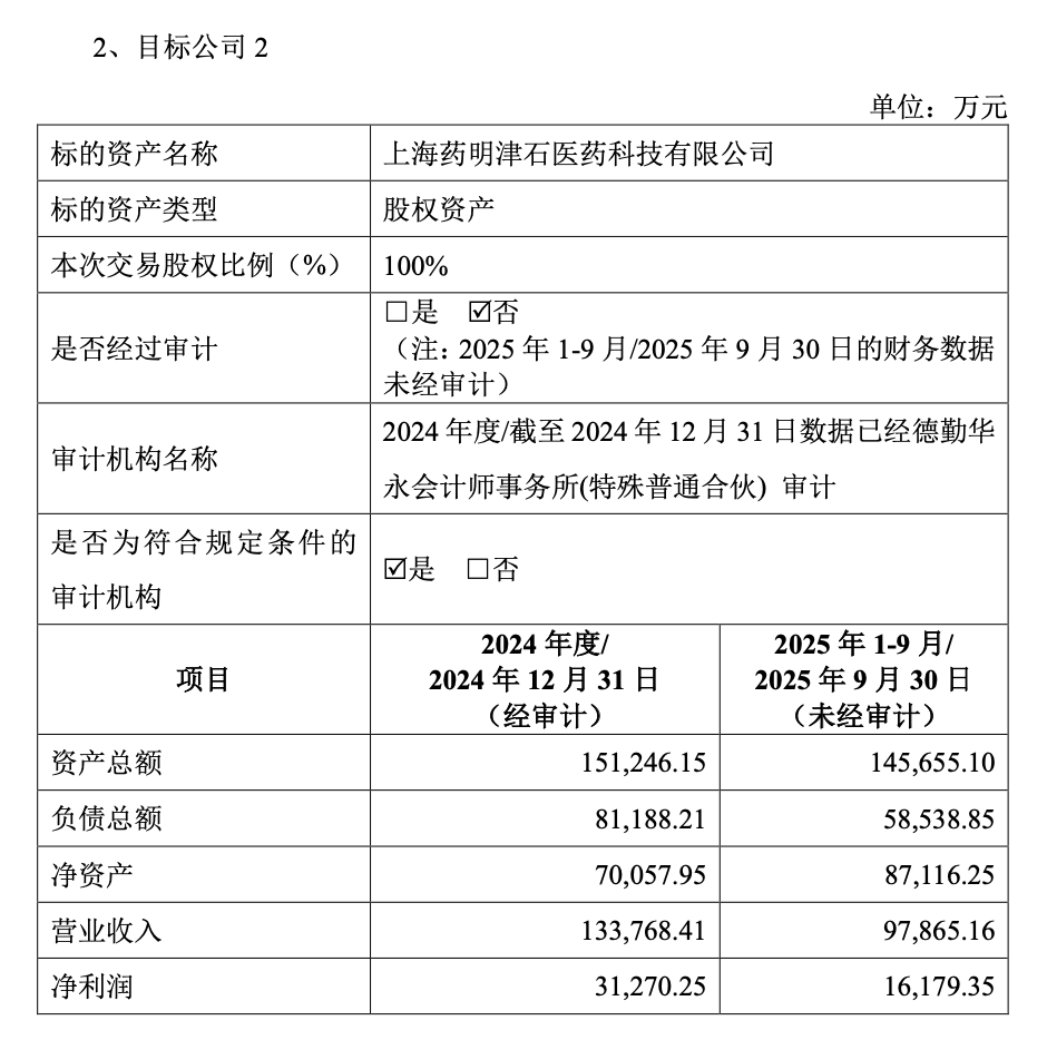 据公告披露,两家公司的业绩分化明显:康德弘翼2024年以及2025年前三季度实现营收分别为2.91亿元、1.86亿元,同期净利润分别为-0.42亿元、-0.75亿元,仍处于亏损状态,相比之下,津石医药表现稳健,2024年以及2025年前三季度实现营收分别为13.38亿元、9.79亿元,同期净利润分别为3.13亿元、1.62亿元。