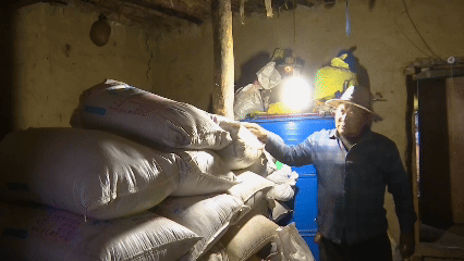 村民罗布家的粮仓里,一袋袋青稞码得整整齐齐。看着这些粒粒饱满的青稞,罗布脸上充满丰收的喜悦。