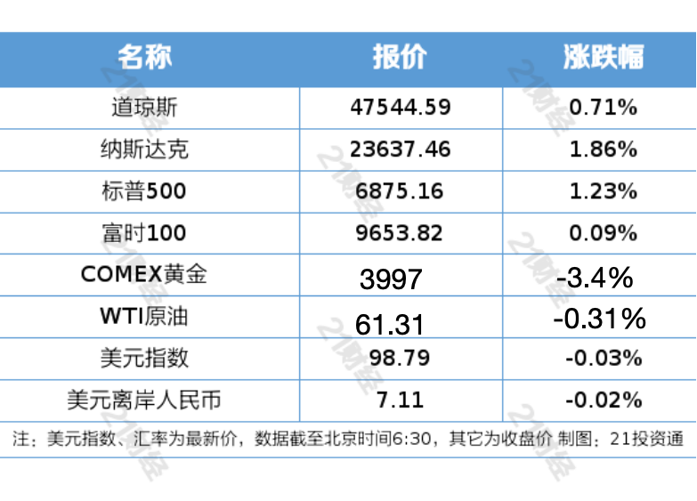 1、10月27日,美股三大指数均续创新高,纳指涨1.86%,标普500指数涨1.23%,道指涨0.71%。苹果、谷歌均再创新高,苹果总市值逼近4万亿美元。纳斯达克中国金龙指数收涨1.59%。欧洲主要股指集体收涨,富时意大利MIB指数涨1%。国际贵金属期货大幅收跌超3%。COMEX黄金期货跌3.4%,报3997美元/盎司;COMEX白银期货跌3.61%,报46.83美元/盎司。