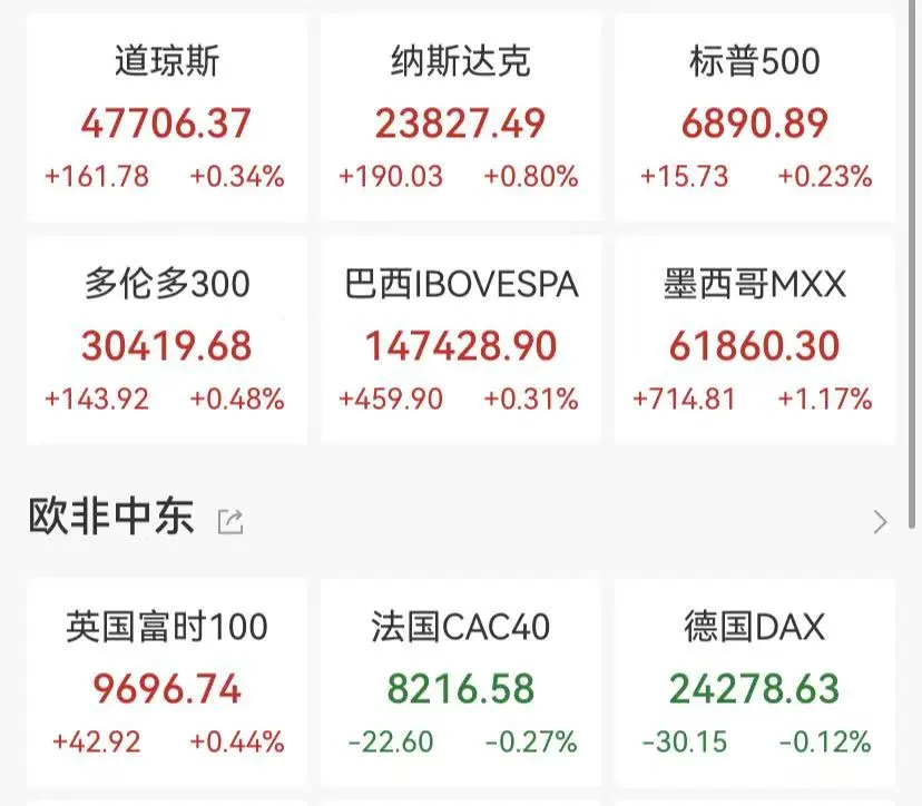 当地时间10月28日,欧美股市多数收涨,其中美国三大股指均续创历史新高,道指涨0.34%,标普500指数涨0.23%,纳指涨0.8%。
