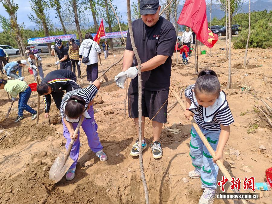乃比江带两个女儿参加公益植树活动。 受访者供图