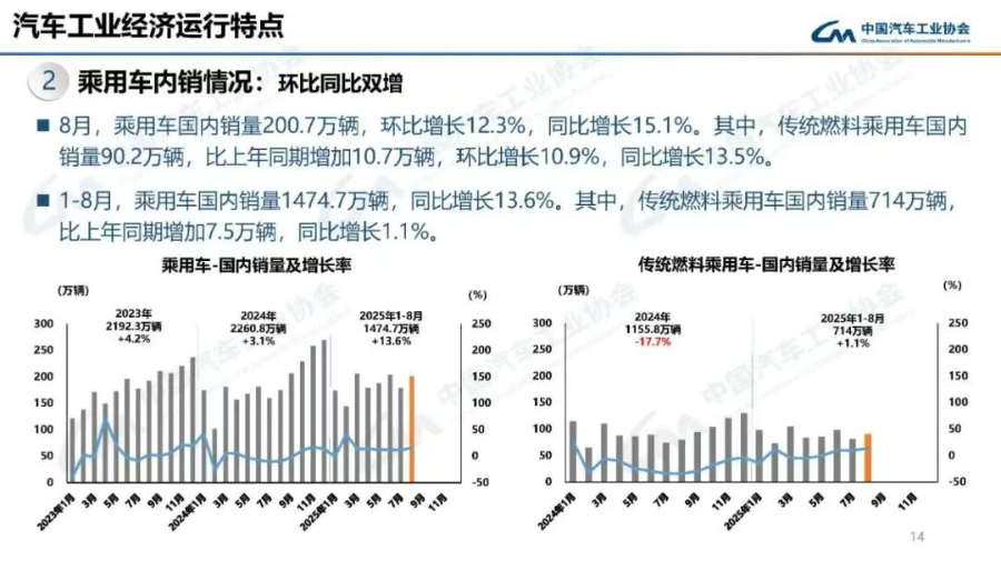 1-8月,乘用车国内销量1474.7万辆,同比增长13.6%。其中,传统燃料乘用车国内销量714万辆,比上年同期增加7.5万辆,占48%。虽然新能源已经超越燃油车的市场份额,但优势仍然是微弱的,燃油车同比依然增长了1.1%。