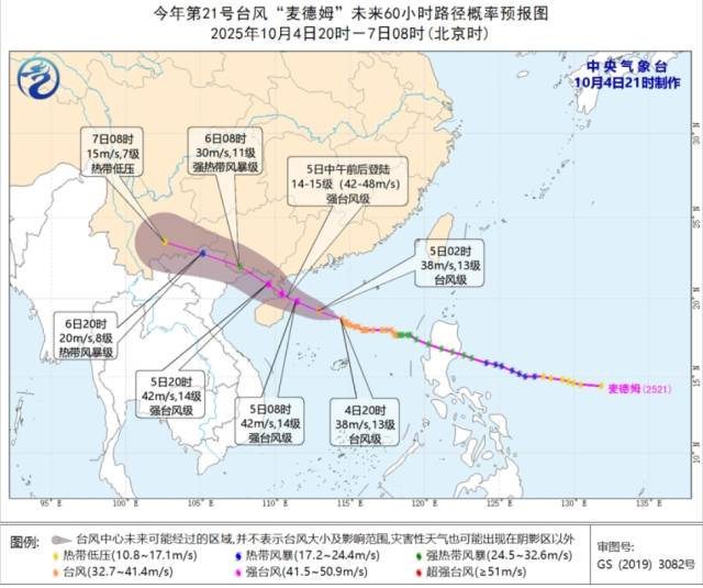 大风预报:4日08时至5日08时,巴士海峡、南海北部和中部海域、东沙群岛、西沙群岛、中沙群岛及黄岩岛附近海域、北部湾中东部、琼州海峡、广西沿海、广东西南部及沿海、海南岛及沿海、台湾岛南部沿海有5-7级、阵风8-10级的大风,其中,南海西北部海域、琼州海峡、广东西部沿海、海南岛东部和北部沿海的风力有8-11级,阵风12-13级,“麦德姆”中心经过的附近海域或地区风力可达12-14级,阵风15-16级。