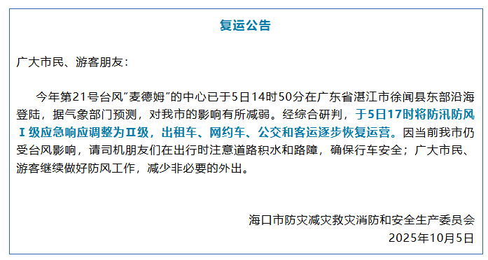 据海口发布今天(10月5日)16时许消息,海南海口市防灾减灾救灾消防和安全生产委员会10月5日发布复运公告。