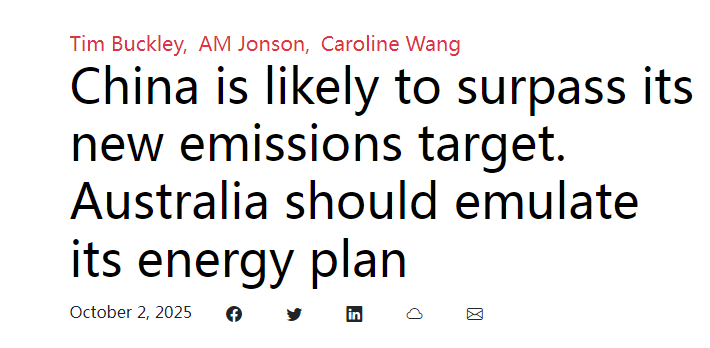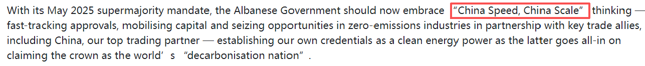 文章说,澳大利亚政府近期也公布了2035年减排目标。澳大利亚能源部长克里斯·鲍文推出的35亿澳元“家庭电池补贴计划”已安装超6万套储能系统,证明政策驱动的转型潜力。分析认为,澳大利亚政府应借鉴“中国速度”,加快审批流程、撬动民营资本,并在零碳产业领域深化与最大贸易伙伴——中国的合作,以确立澳大利亚在清洁能源领域的竞争力。